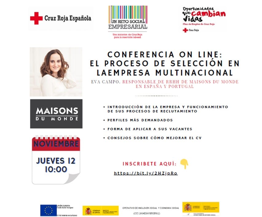 En el marco del proyecto Reto Social Empresarial: Alianzas por la inserción laboral de la asamblea de Cruz Roja en Granada, organizamos una interesante Conferencia con Eva Campo, la Responsable de RRHH de Maisons du Monde para España y Portugal. En dicha conferencia nos dará detalles sobre los procesos de selección en una empresa con presencia en la mayor parte de los países de Europa y con más de 20 tiendas en España: cómo se desarrolla el proceso, perfiles más demandados y forma de aplicar a sus vacantes para conseguir que te llamen a entrevista.
