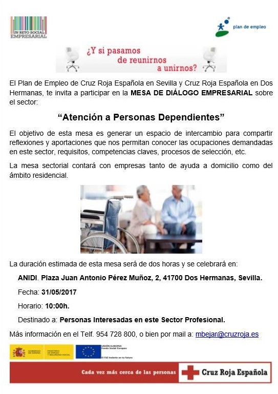 El objetivo de esta mesa de diálogo organizada por el Plan de Empleo de Cruz Roja en Sevilla y las principales empresas del Sector de la Atención a la Dependencia, es generar un espacio de intercambio para compartir reflexiones y aportaciones que nos permitan conocer las ocupaciones demandadas, requisitos, competencias claves, procesos de selección, etc.